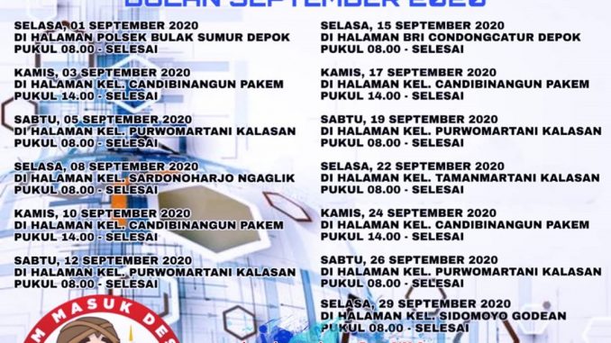 Untuk memudahkan dalam pelayanan kepada Masyarakat, terutama bidang penerbitan SIM, berikut Jadwal Sim Masuk Desa (SIMMADE) Bulan September 2020 Satlantas Polres Sleman.